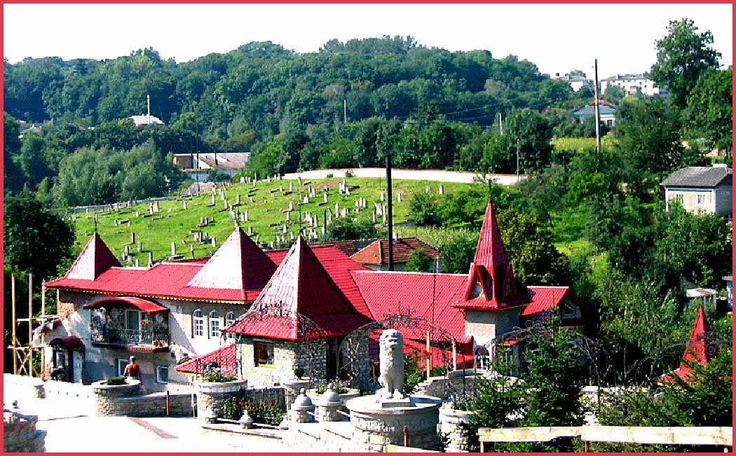 These views of the Jewish cemetery in Skala were taken in 2004. The building with the red roofs and "kitsch architecture" (as the photographer characterized it) is a hotel - restaurant - sauna called "Vesta" that was being built in 2004, on the former site of the Jewish communal bath.