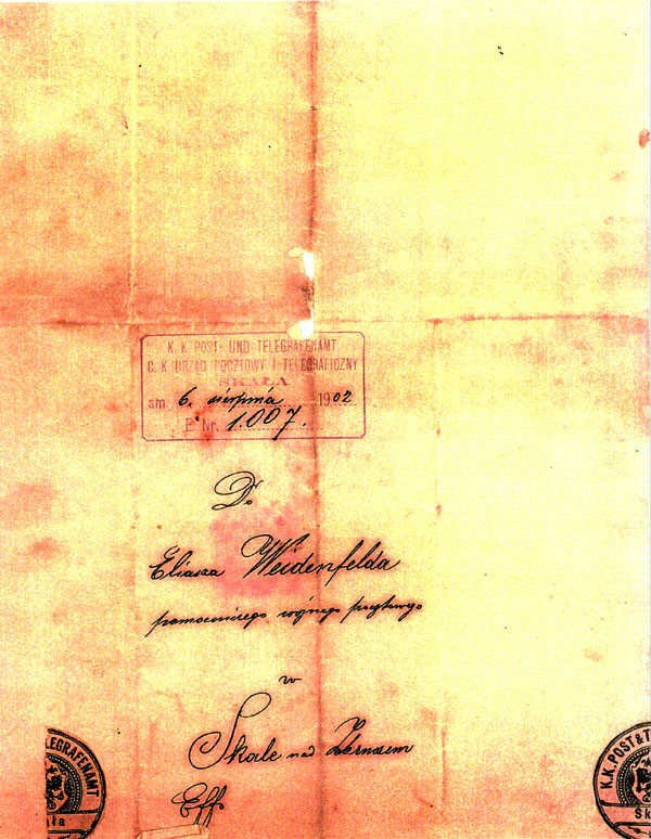 | Elias Weidenfeld was born December 1, 1872 in the Galician town of Jezupol. He was the son of Tsvi Hersch Weidenfeld and Fanny Wasserbach. As these documents confirm, Elias worked in the Skala post office from October, 1901 to August, 1902. He died in Akron, Ohio on July 12, 1960. |