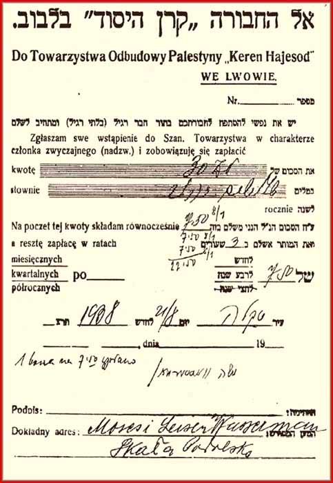 It is my wish to join your association as a (regular) (non-regular) member and I take it upon myself to pay the sum of 30.00 zloty per year. As an advance payment on that sum, I am presently paying the sum of 7.50 zloty and I will pay the outstanding balance in 3 installments of 7.50 (per month), (per quarter), (per half-year).The document was signed by Moses Wasserman, on his own behalf and for his son Leiser. Moses, who was born in 1868, was the son of Schaje and Chaje Wasserman. His marriage to Cirel Weidenfeld (daughter of Alter Mates Weidenfeld and Beila Wiesenthal) was registered in 1898, as was the birth of their son Leiser. Moses died in 1940. His wife Cirel, Leiser and his wife Regina and children Nusia and Miecio, and Mechel and his wife Pesia all perished in the Holocaust. [Skala yizkor book, pp. 94-95]In the city of Skala, day 21, month 8, year 1938. Signature: Moses and Leiser Wasserman, Skala Podolska.