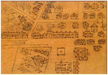 The Marketplace [Independence Square, Nepriklausomybės aikštė] (map): Here is where the marketplace began. A cross stood at the center of a beautiful wooden fence. Across from the marketplace was a church with a bell, encircled by very old elm trees. The priest's household was located behind the church. Every Thursday people came to the market. The farmers brought their products to sell to the shtetl: corn, wheat, barley, oats, peas, cheese, butter, as well as animals and birds.